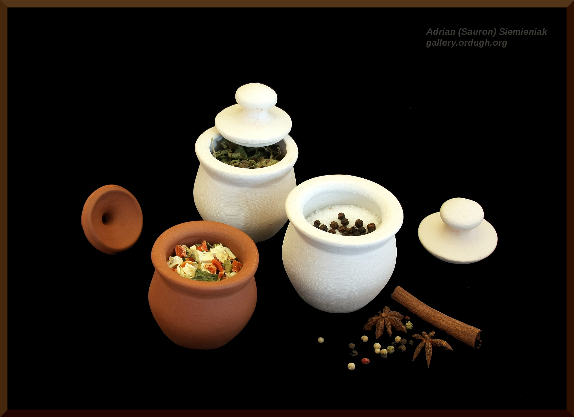 Gliniane pojemniki na zioła i przyprawy. Glina w kolorze jasnej czekolady i przyćmionej bieli. Wzorowane na pojemnikach średniowiecznych.